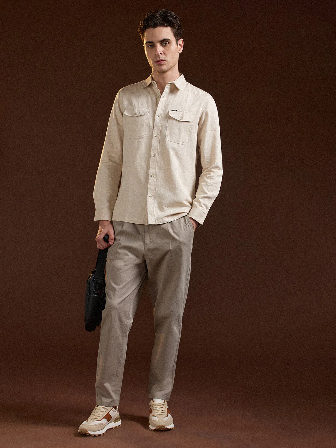 Beige Solid Slim Fit Casual Shirt with Flap Pockets