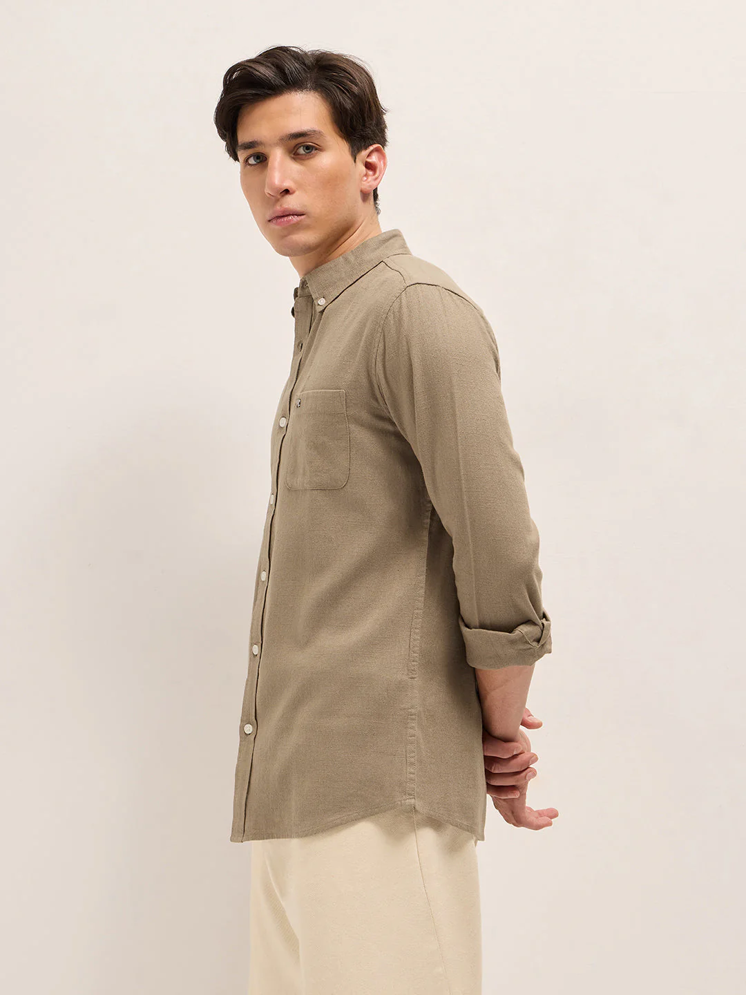 Beige Solid Slim Fit Cotton Casual Shirt with Button-Down Collar