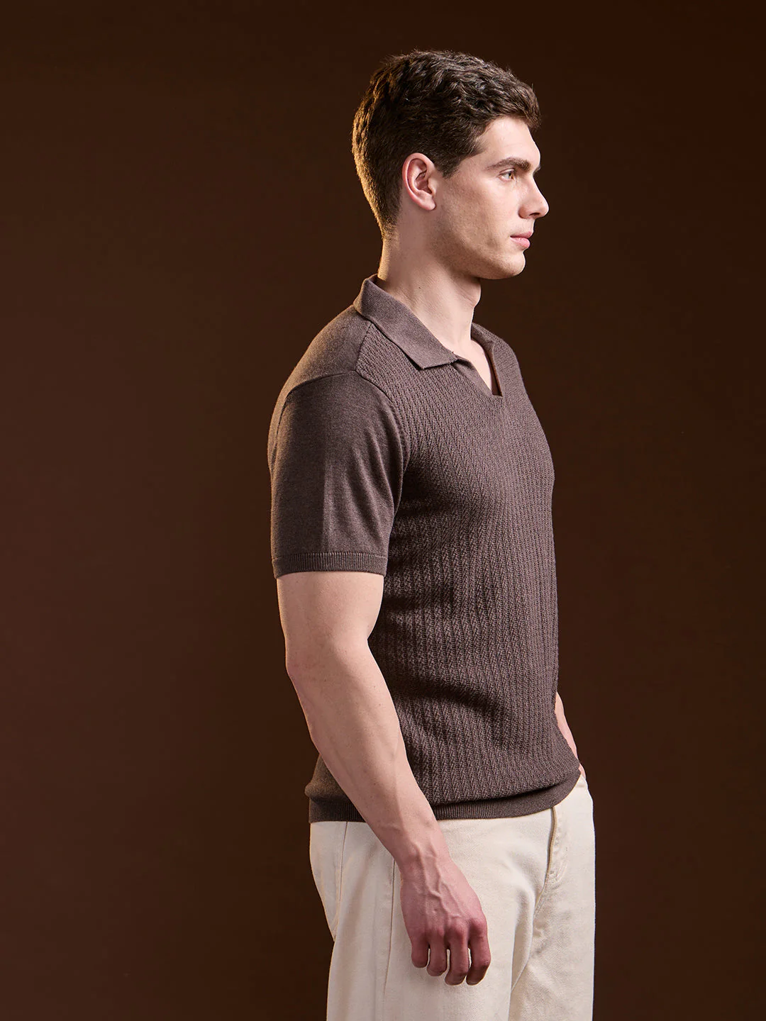 Brown Ribbed Texture Design Slim Fit Polo