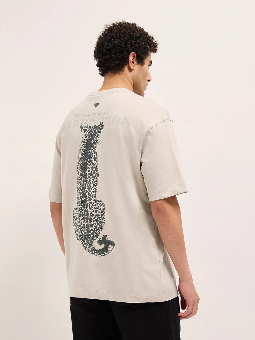 Cream Crew Neck Graphic Print T-Shirt with Leopard Illustration on Back
