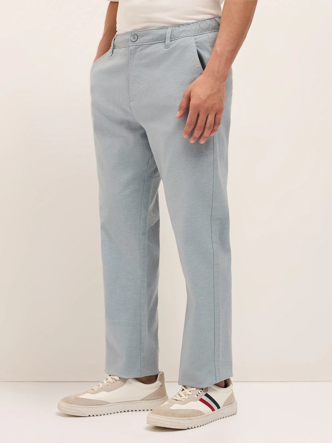 Beige Textured Straight Fit Casual Trousers with an Elasticated Waistband